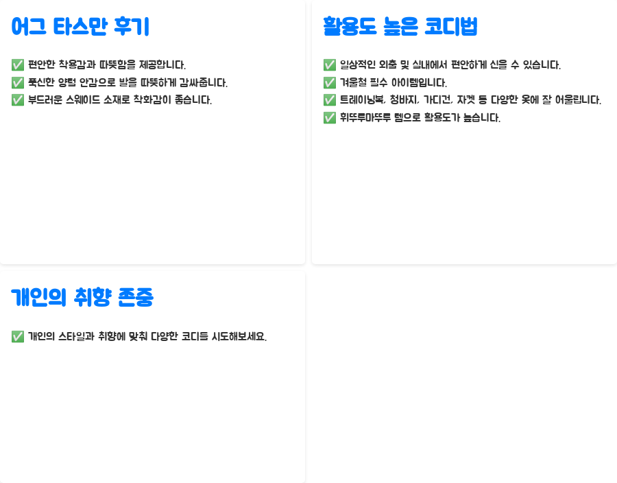 많은 사용자들은 어그 타스만 슬리퍼에 대해 편안한 착용감과 따뜻함을 가장 큰 장점으로 꼽고 있습니다.