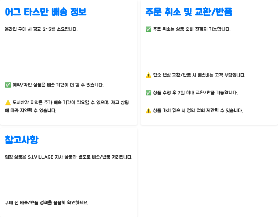 특히, 입점 상품의 경우에는 S.I.VILLAGE 자사 상품과 별도로 배송 및 반품이 진행되므로, 이점 유의하시기 바랍니다.