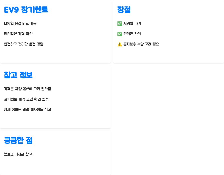 오늘 알아본 EV9 장기렌트 정보가 도움이 되셨으면 좋겠네요! 다양한 옵션과 가격 비교를 통해 자신에게 꼭 맞는 EV9 장기렌트를 선택하시길 바랍니다.