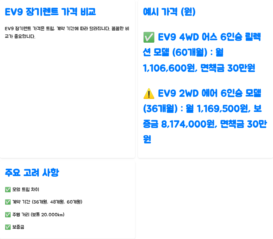 이처럼 모델, 계약 기간, 보증금에 따라 월 렌트료는 크게 달라질 수 있으므로, 꼼꼼한 비교가 필수입니다. 자신의 예산과 이용 조건에 맞춰 가장 적합한 옵션을 선택하는 것이 EV9 장기렌트를 성공적으로 이용하는 첫걸음입니다.