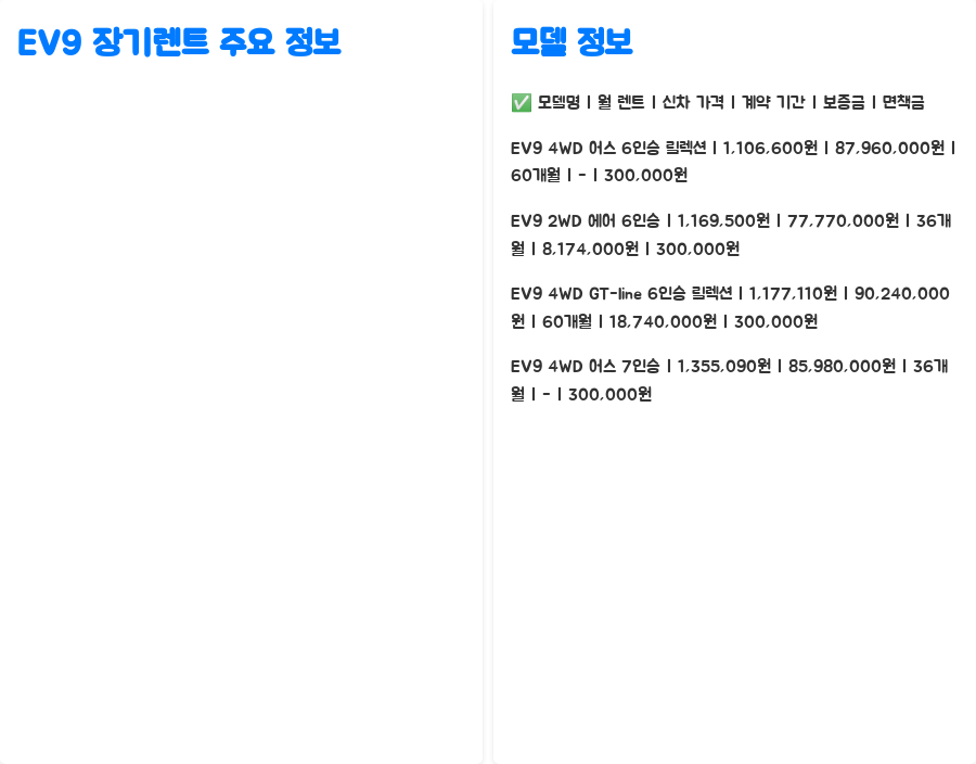이 글에서는 EV9 장기렌트의 다양한 옵션과 가격, 그리고 장기렌트를 선택해야 하는 이유까지 꼼꼼하게 알아보겠습니다.
