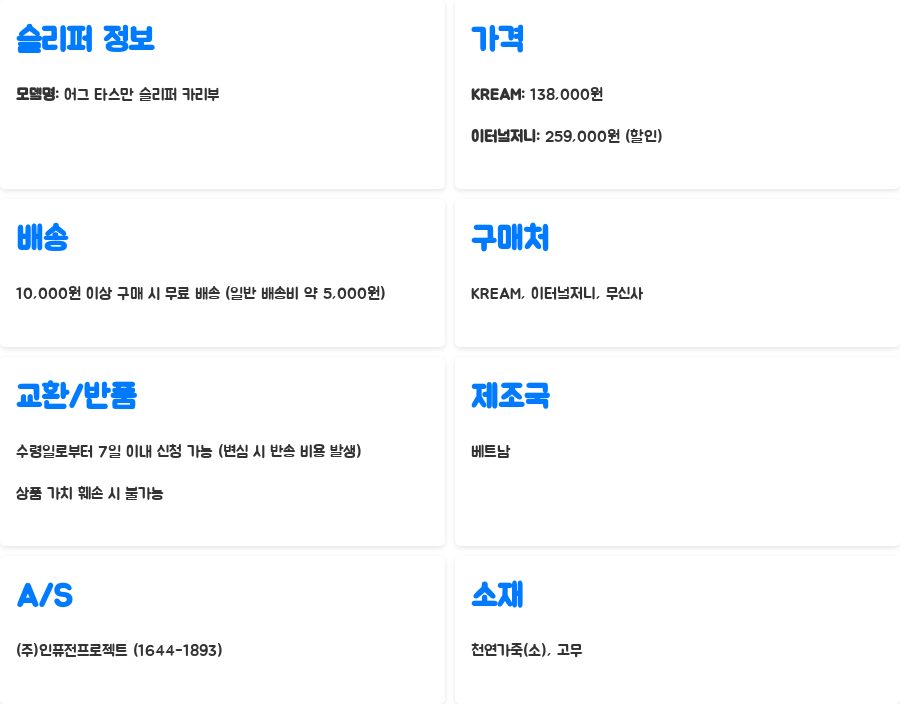 오늘 어그 타스만 카리부 슬리퍼에 대해 알아봤습니다. 가격 비교부터 구매처, 배송, 반품 정보까지 꼼꼼하게 살펴봤는데, 도움이 되셨나요?