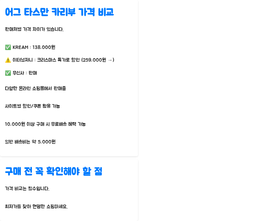 어그 타스만 카리부 슬리퍼의 가격은 판매처에 따라 다릅니다. 가장 중요한 가격 정보부터 확인해볼까요? KREAM에서는 138,000원에 판매하고 있으며, 이터널저니에서는 크리스마스 시즌 특가로 259,000원에서 할인된 가격으로 만나볼 수 있습니다.