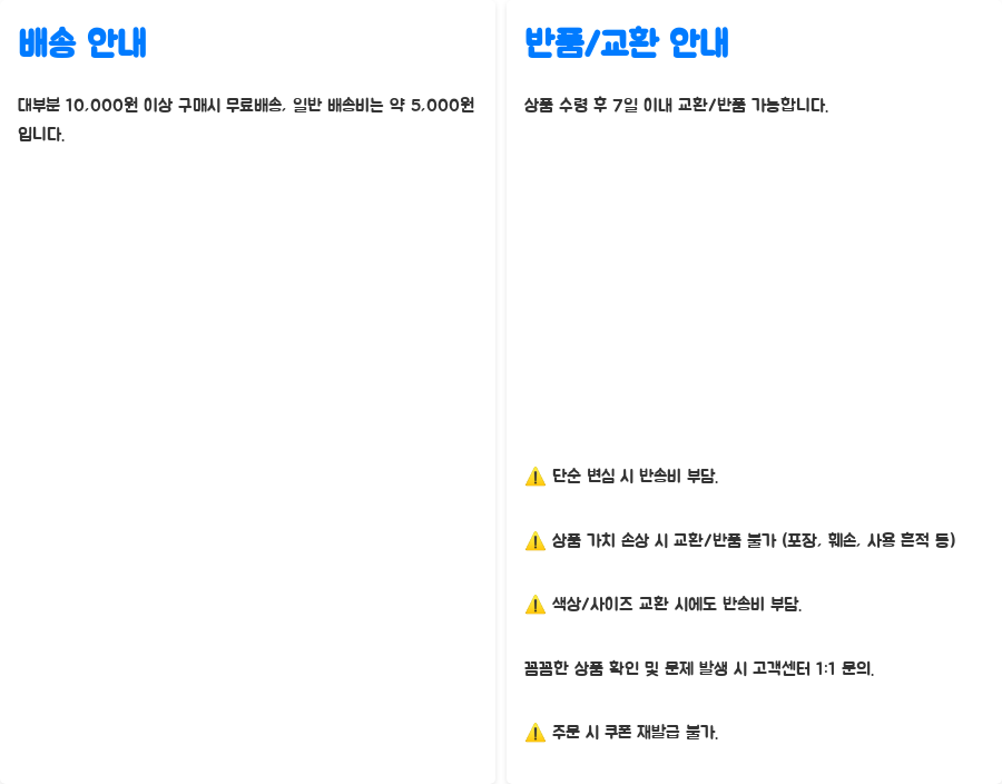 | 교환/반품 | 수령일로부터 7일 이내 신청 가능 (단순 변심 시 반송 비용 발생), 상품 가치 훼손 시 불가능 |