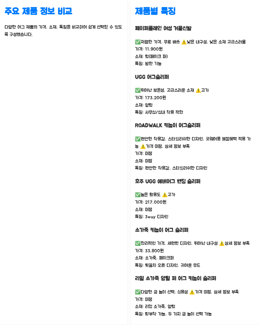 | UGG 어그슬리퍼 | 173,200원 | 양털 | 사무실/실내 착용 적합 | 뛰어난 보온성, 고급스러운 소재 | 고가 |