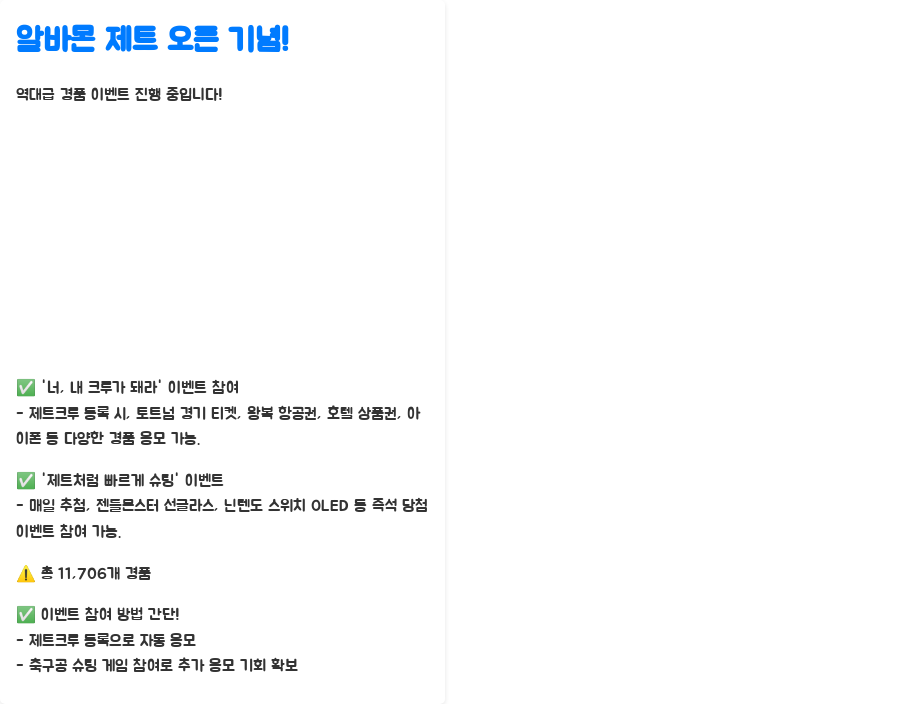 알바몬 제트 론칭을 기념하여 역대급 경품 이벤트가 진행 중입니다! '너, 내 크루가 돼라' 이벤트에 참여하여 제트크루에 등록하면, 토트넘 경기 티켓과 왕복 항공권, 파크하얏트 호텔 상품권, 아이폰 15 프로 등 꿈꿔왔던 엄청난 경품을 받을 수 있는 기회가 주어집니다.