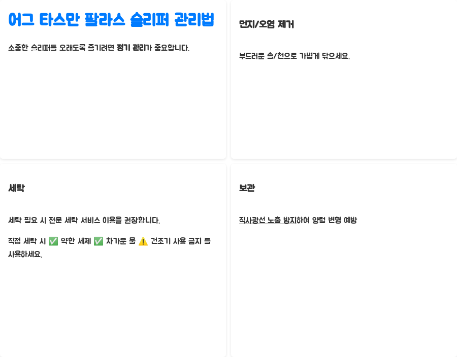 소중한 어그 타스만 팔라스 슬리퍼를 오랫동안 아끼고 싶다면? 정기적인 관리가 필수입니다! 먼지나 오염물질이 묻었을 경우, 부드러운 솔이나 천으로 가볍게 닦아주세요.