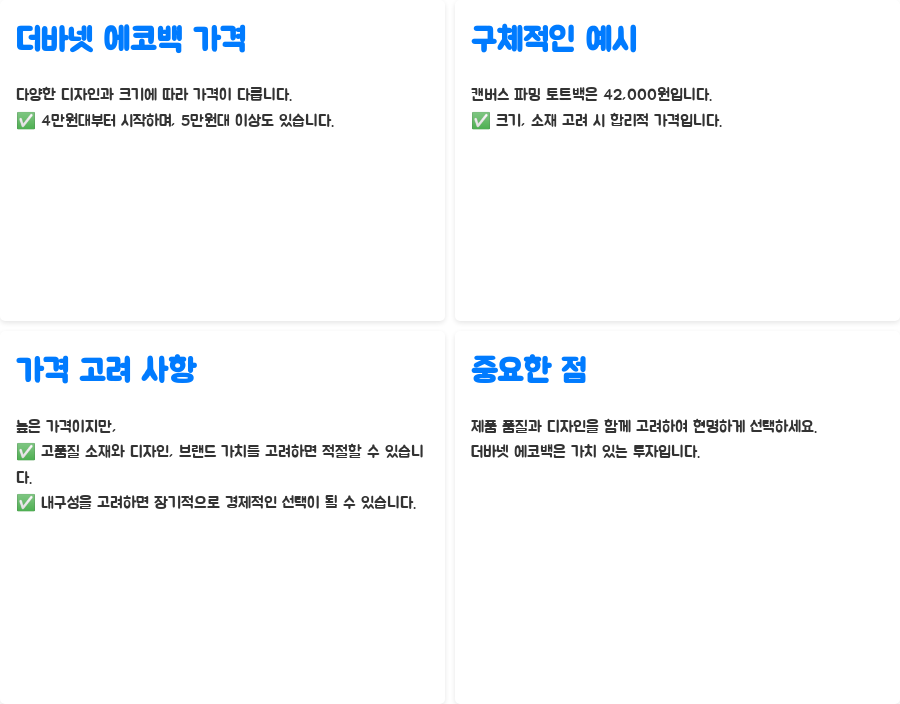더바넷 에코백의 가격은 디자인과 크기에 따라 다르지만, 4만원대부터 시작하여 5만원대 이상까지 다양합니다.