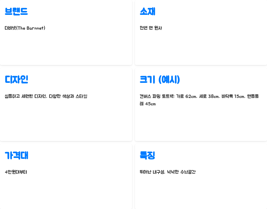 | 크기(예시) | 캔버스 파밍 토트백: 가로 62cm, 세로 38cm, 바닥폭 15cm, 핸들둘레 45cm |