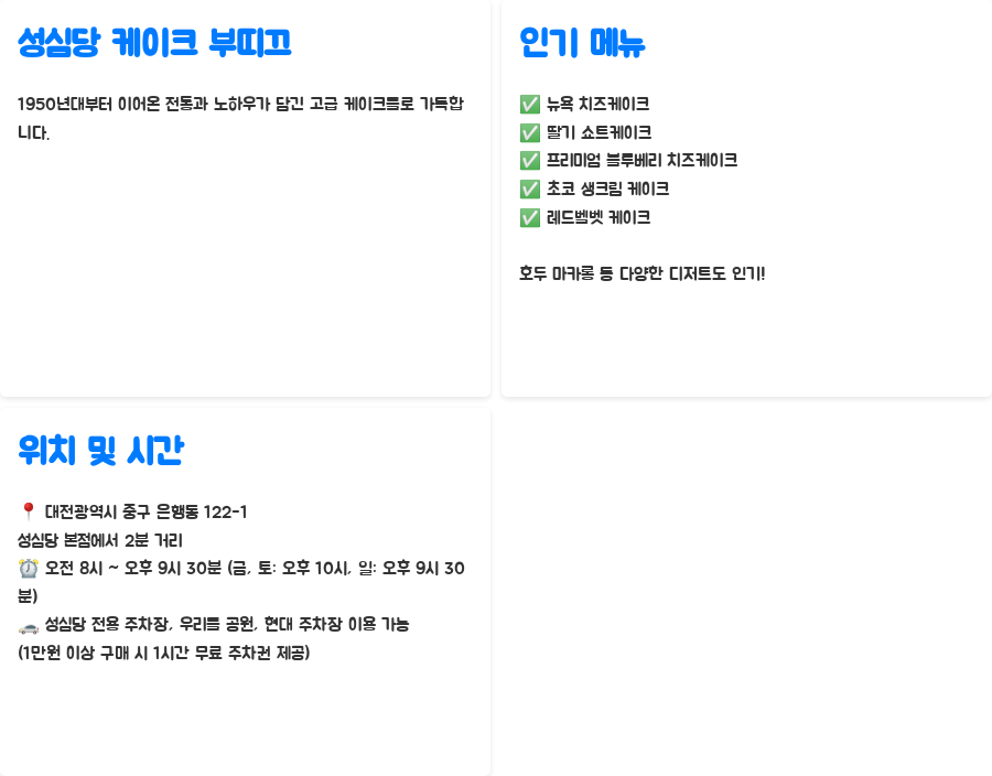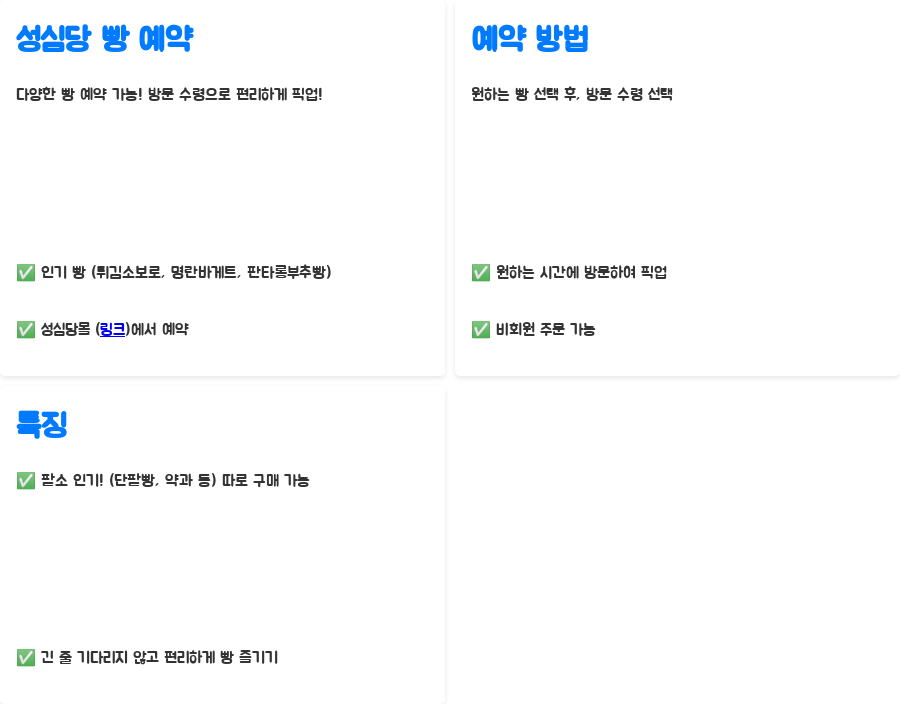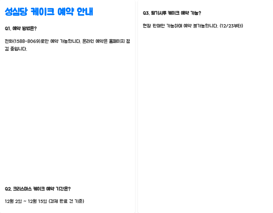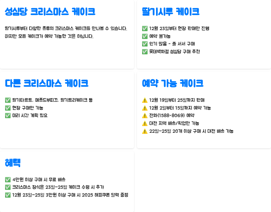 | 크리스마스 케이크 예약 | 12월 2일 오픈, 12월 15일 마감(전화 예약만 가능), 대전 지역 배송/픽업 |