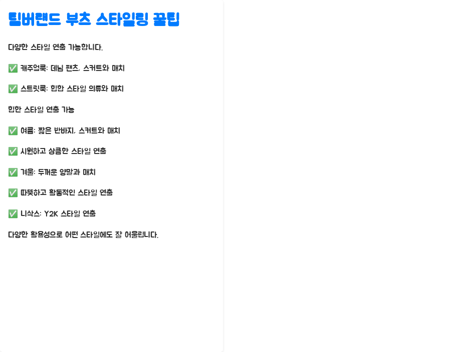 팀버랜드 부츠는 다양한 활용성을 지니고 있어 어떤 스타일에도 잘 어울립니다.