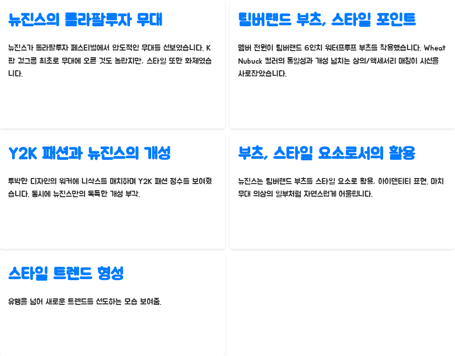 특히 로우라이즈 스커트와 팀버랜드 부츠의 조합은 Y2K 스타일을 완벽하게 재현하며, 뉴진스만의 독창적인 스타일을 보여주었습니다. 이처럼 멤버들은 팀버랜드 부츠를 베이스로 자신만의 스타일을 완성하여 다채로운 스타일을 선보였습니다.