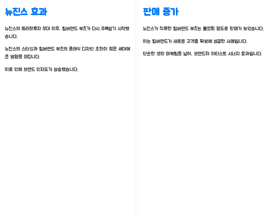 뉴진스가 착용한 팀버랜드 부츠는 품절이 되는 등 실질적인 판매 증가로 이어지고 있으며, 팀버랜드는 뉴진스를 통해 새로운 고객층을 확보하는데 성공했습니다. 이는 단순한 셀럽 마케팅을 넘어, 브랜드와 아티스트의 시너지 효과를 보여주는 훌륭한 사례라고 할 수 있습니다.
