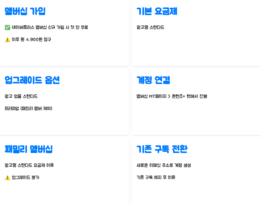 | 가입 및 무료 체험 | 네이버플러스 멤버십 신규 가입 시 첫 달 무료, 이후 월 4,900원 청구 |