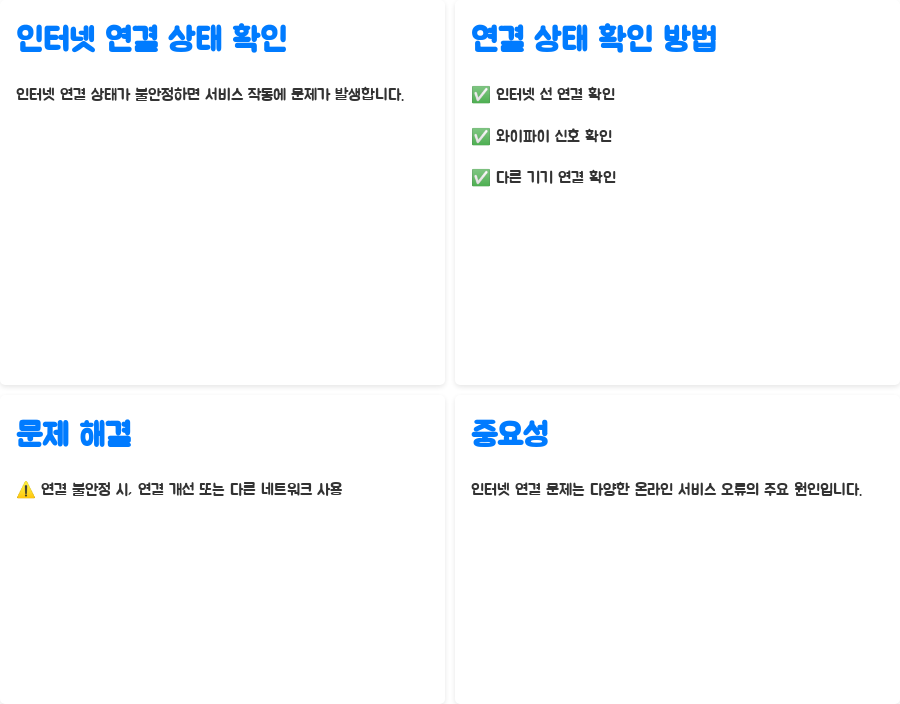 인터넷 연결 문제는 많은 온라인 서비스 오류의 가장 흔한 원인이므로, 꼼꼼하게 체크해야 합니다.