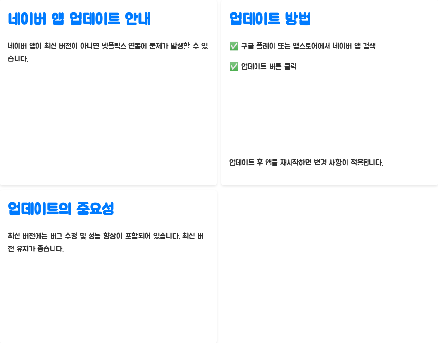 네이버 앱이 최신 버전이 아닌 경우, 기능 호환성 문제로 인해 넷플릭스 연동에 오류가 발생할 수 있습니다.