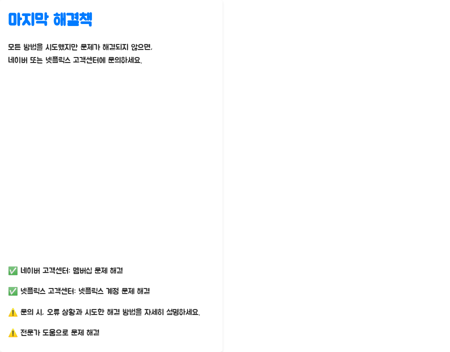 위의 모든 방법을 시도했는데도 문제가 해결되지 않는다면, 네이버 고객센터 또는 넷플릭스 고객센터에 문의하는 것이 좋습니다.