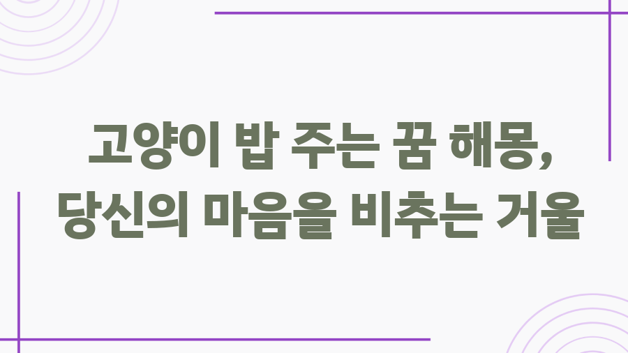 고양이에게 밥을 주는 꿈, 무슨 뜻일까요? 복잡한 꿈의 세계에서 길잡이가 되어줄 해몽의 시간입니다. 단순히 고양이에게 밥을 주는 행위가 아닌, 꿈 속 상황과 당신의 감정까지 고려하여 꿈의 메시지를 풀어보도록 하겠습니다. 지금부터 여러분의 꿈을 분석하고 해석하는 흥미진진한 여정을 시작해 보세요!