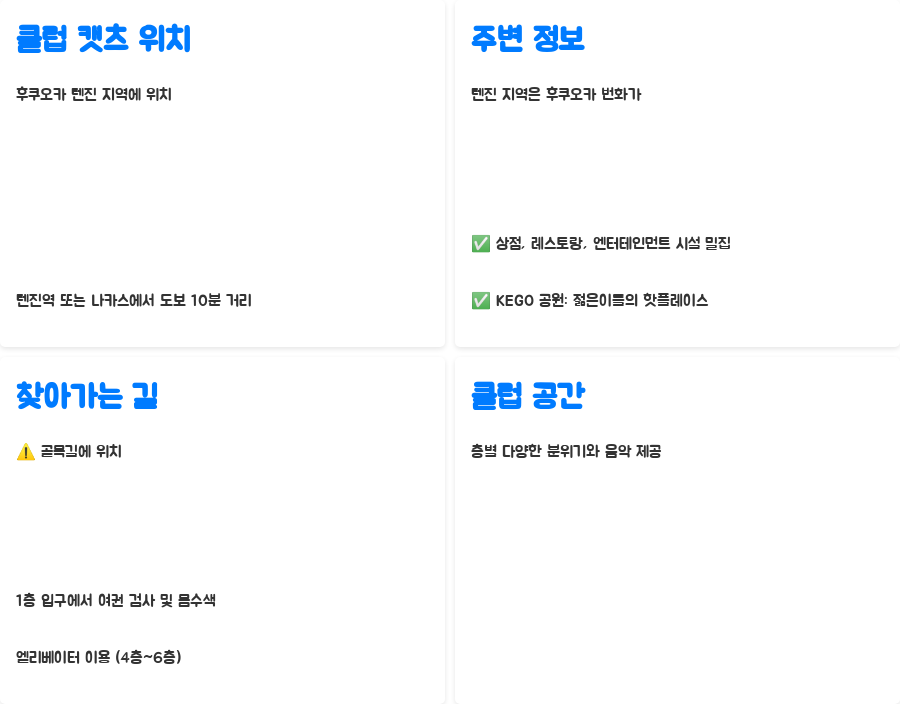 후쿠오카 클럽 캣츠는 후쿠오카 텐진 지역에 위치해 있습니다. 텐진역이나 나카스에서 도보로 10분 정도 거리에 있어 접근성이 뛰어납니다. 텐진 지역은 후쿠오카의 번화가로, 다양한 상점과 레스토랑, 엔터테인먼트 시설이 밀집해 있어 밤에도 활기 넘치는 곳입니다. 특히 텐진역 뒤편에 있는 KEGO 공원은 젊은이들의 핫플레이스로, 클럽 캣츠를 방문하기 전후에 공원에서 산책을 즐기거나, 친구들과 이야기꽃을 피우는 것도 좋은 선택입니다. 클럽 캣츠는 골목길에 위치해 있어 처음 찾는 사람들은 조금 헤맬 수도 있지만, 건물 1층에 있는 입구를 찾으면 쉽게 입장할 수 있습니다. 1층 입구에서 가드에게 여권 검사를 받고 몸수색을 거친 후 엘리베이터를 타고 4층부터 6층까지 이어지는 클럽 공간으로 이동하면 됩니다. 클럽 캣츠는 층마다 다른 분위기와 음악을 제공하여 취향에 따라 선택해서 즐길 수 있습니다.