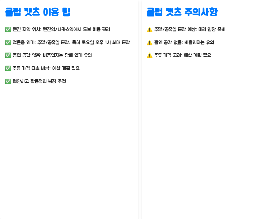 후쿠오카 클럽 캣츠를 방문하기 전에 몇 가지 팁과 주의사항을 알아두면 더욱 즐거운 시간을 보낼 수 있습니다. 첫째, 클럽 캣츠는 텐진 지역에 위치해 있기 때문에, 텐진역이나 나카스역에서 내려 도보로 이동하는 것이 편리합니다. 둘째, 클럽 캣츠는 젊은층을 중심으로 인기가 많기 때문에, 주말이나 공휴일에는 매우 붐빌 수 있습니다. 특히, 토요일 오후 1시에는 클럽이 가장 붐비기 때문에, 이 시간대에 방문을 계획한다면 미리 입장 준비를 하는 것이 좋습니다. 셋째, 클럽 캣츠는 흡연 공간이 따로 마련되어 있지 않기 때문에, 비흡연자라면 담배 연기 때문에 불편함을 느낄 수 있습니다. 넷째, 클럽 내부의 주류 가격은 다소 비싼 편이니, 미리 예산을 계획하는 것이 좋습니다. 마지막으로, 클럽 캣츠는 젊은층을 중심으로 인기가 많기 때문에, 편안하고 활동적인 복장을 착용하는 것이 좋습니다.