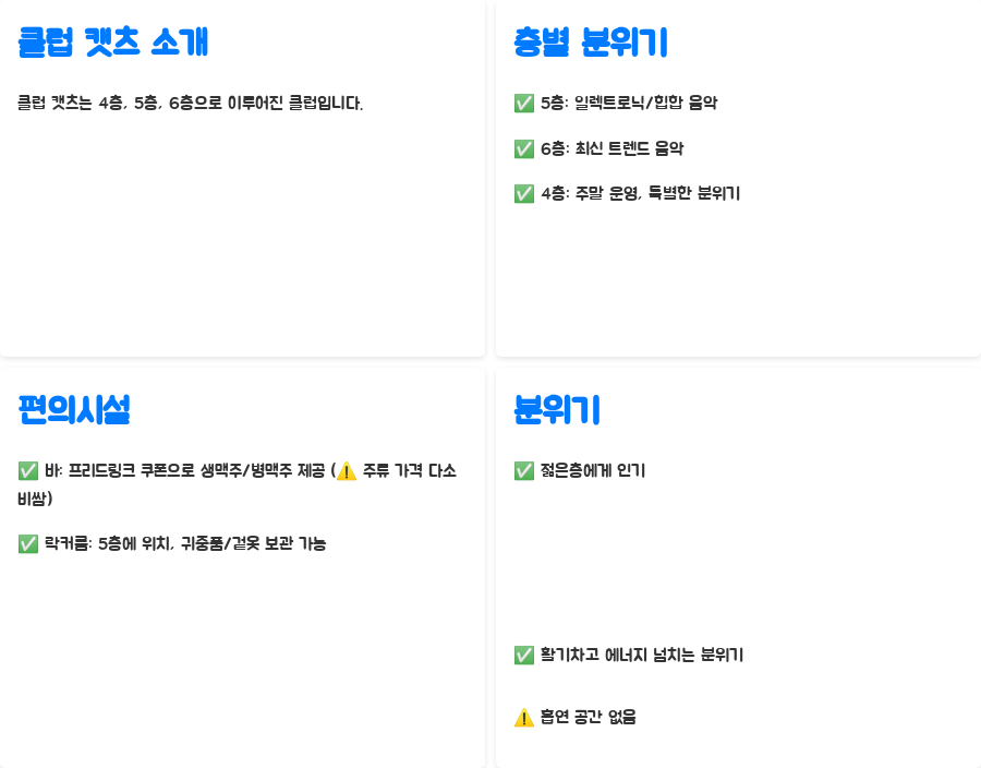 | 클럽 캣츠 | 3개 층으로 다양한 음악과 분위기를 제공 | 흡연 공간 부족 |
