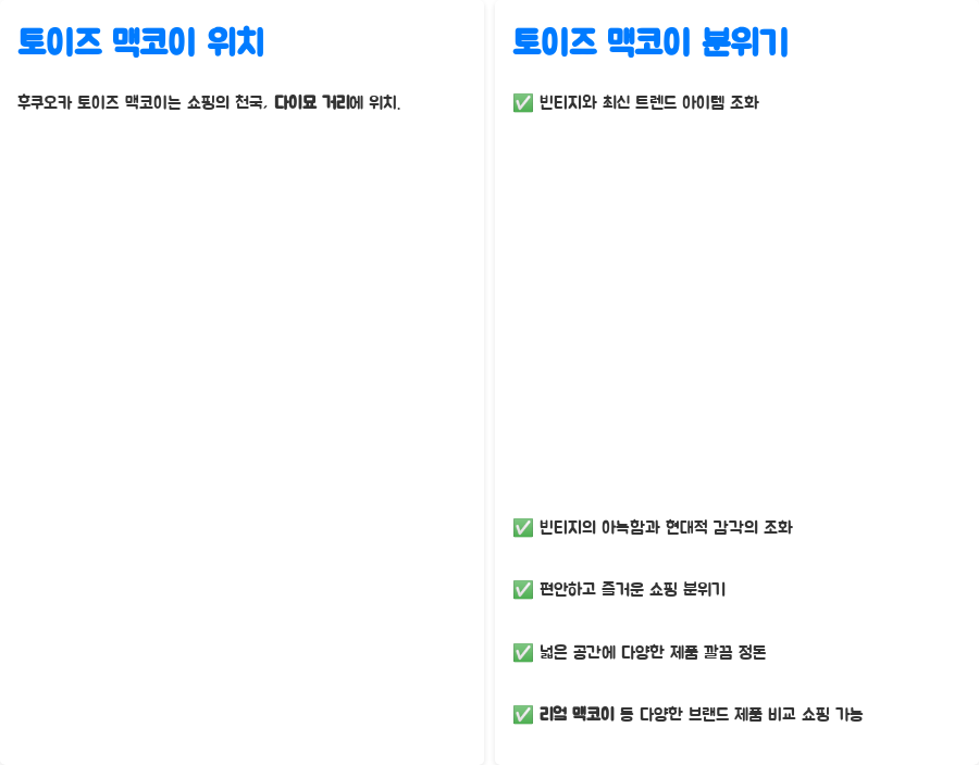 다이묘 거리는 토이즈 맥코이 외에도 다양한 편집샵과 브랜드 매장이 밀집해 있어, 쇼핑을 즐기기에 최적의 장소입니다. 다음 표는 다이묘 거리 주요 쇼핑 스팟과 특징을 비교 분석한 것입니다.