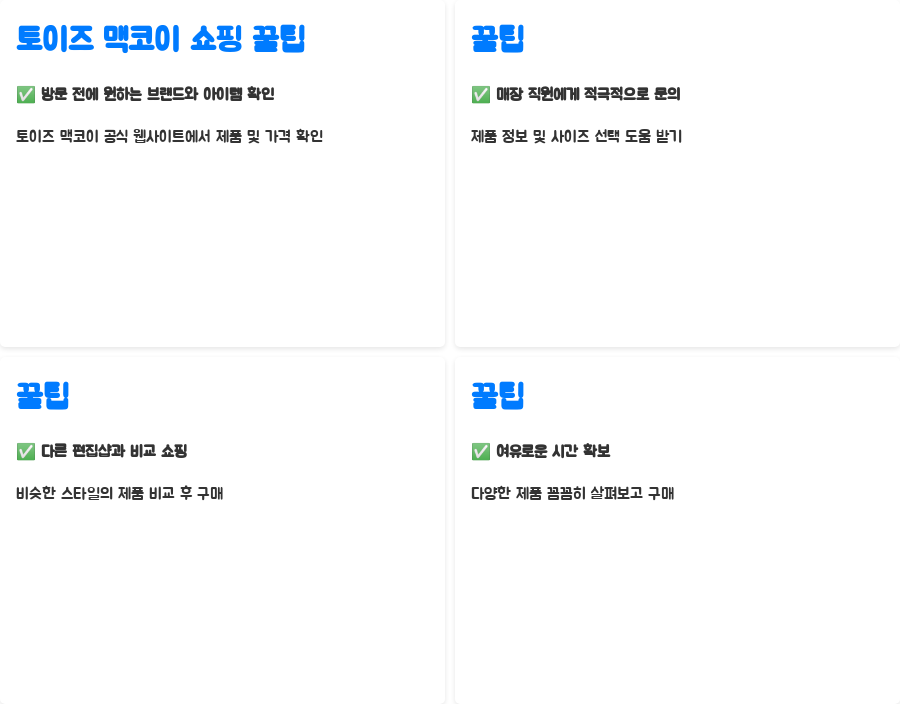| 쇼핑 팁 | 방문 전 제품 확인, 직원 문의, 다른 매장과 비교, 여유로운 시간 확보 |