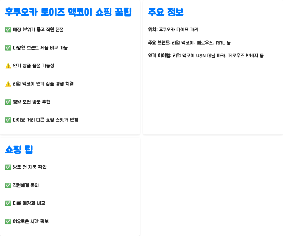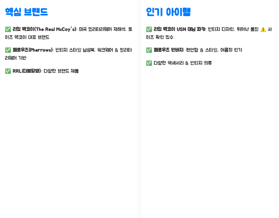 | 토이즈 맥코이 | 리얼 맥코이, 페로우즈, RRL | 빈티지와 최신 트렌드 아이템의 조화, 넓은 공간 | 다양한 브랜드 비교 쇼핑 가능, 친절한 직원 | 인기 상품 사이즈 부족 가능성 |