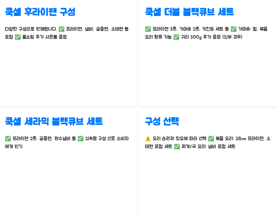 | 쿡셀 후라이팬 종류 | 쿡셀 더블 블랙큐브, 쿡셀 세라믹 블랙큐브 등 |