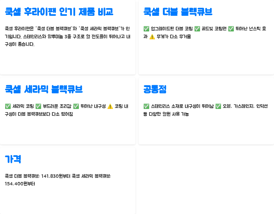 | 쿡셀 세라믹 블랙큐브 | 세라믹 코팅, 부드러운 조리감 | 154,400원부터 | 부드러운 조리감, 뛰어난 내구성 | 코팅 내구성이 더블 블랙큐브에 비해 다소 떨어짐 |