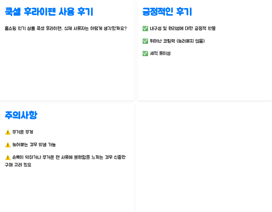 쿡셀 후라이팬은 홈쇼핑에서 큰 인기를 끌고 있지만, 실제 사용 후기는 어떨까요? 실제 구매자들은 제품의 내구성과 편리함에 대해 긍정적인 반응을 보이고 있습니다. 특히, 스테인리스 소재임에도 불구하고 눌러붙지 않는 뛰어난 코팅력과 세척의 용이성을 높이 평가하는 후기가 많습니다.