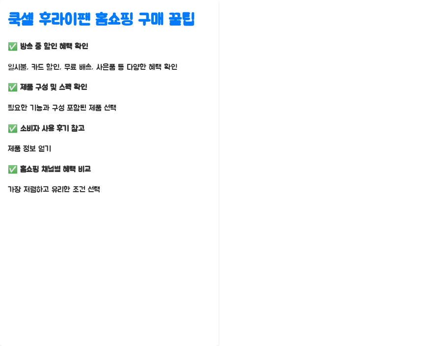 | 구매 팁 | 홈쇼핑 방송 할인 혜택 확인, 구성 및 스펙 확인, 사용 후기 참고, 채널별 혜택 비교 |