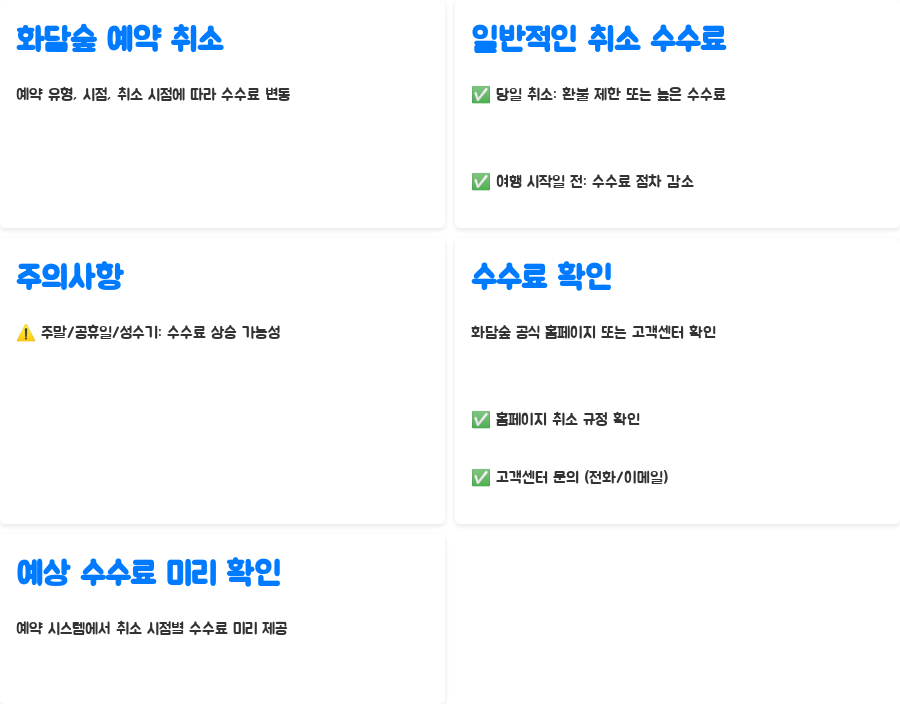 A. 화담숲 예약 취소 수수료는 예약 유형, 취소 시점, 성수기 여부 등 여러 요인에 따라 달라집니다. 당일 취소는 환불이 제한되거나 수수료가 가장 높으며, 취소 시점이 여행 시작일로부터 멀어질수록 수수료가 감소합니다. 정확한 수수료는 공식 홈페이지나 고객센터를 통해 확인해야 합니다.