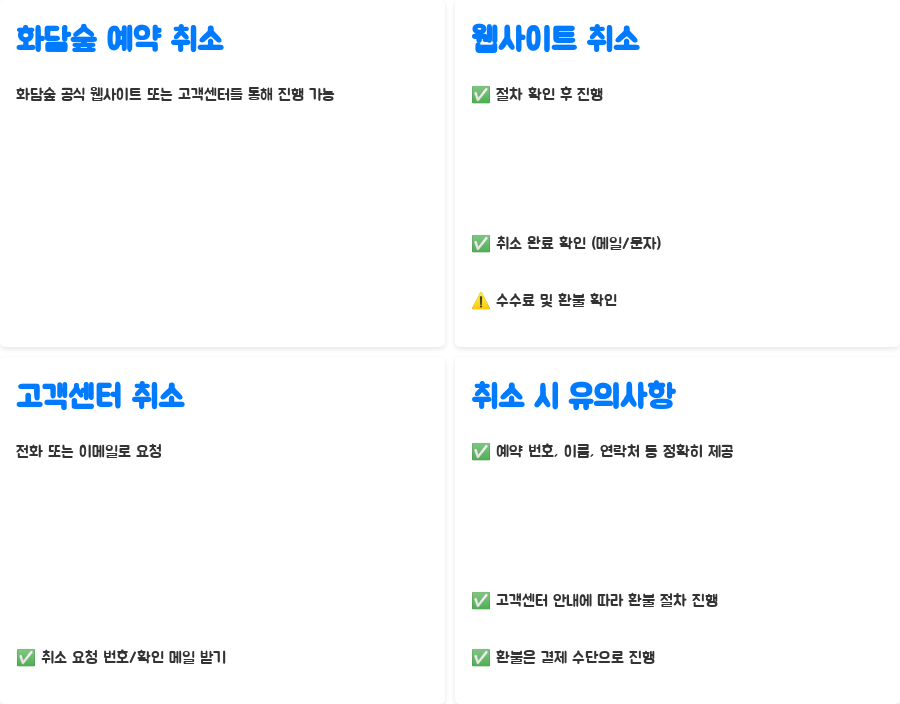 A. 화담숲 공식 웹사이트 또는 고객센터(전화 또는 이메일)를 통해 취소가 가능합니다. 웹사이트를 통해 취소할 경우 안내에 따라 절차를 진행하고 확인 메일을 받아두세요. 고객센터를 이용할 경우 취소 요청 번호를 받아두는 것이 좋습니다. 예약 번호, 이름, 연락처 등 필요한 정보를 정확하게 제공해야 합니다.