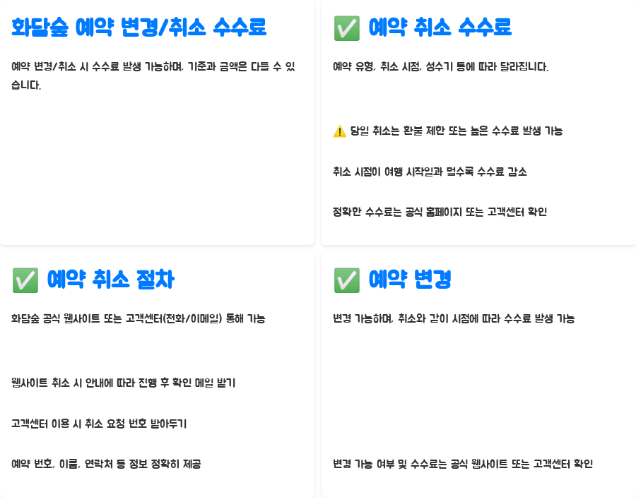 A. 예약 변경 또한 가능하지만, 취소와 마찬가지로 시점에 따라 수수료가 부과될 수 있습니다. 변경 가능 여부 및 수수료는 화담숲 공식 웹사이트 또는 고객센터를 통해 확인하는 것이 가장 정확합니다.