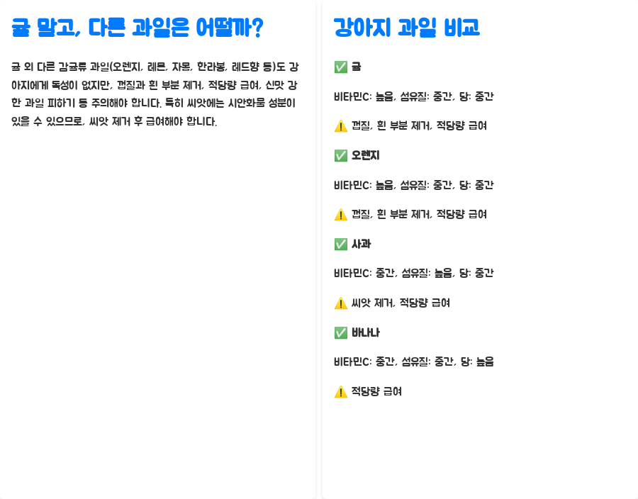 귤 외 다른 감귤류 과일 (오렌지, 레몬, 자몽, 한라봉, 레드향 등) 역시 강아지에게 독성이 있는 것은 아니지만, 주의사항은 동일합니다. 껍질과 흰 부분을 제거하고, 적당량을 급여하며, 신맛이 강한 과일은 피하는 것이 좋습니다. 특히 씨앗에는 시안화물 성분이 포함되어 있을 수 있으므로, 씨앗이 있는 과일은 씨앗을 제거한 후 급여해야 합니다.