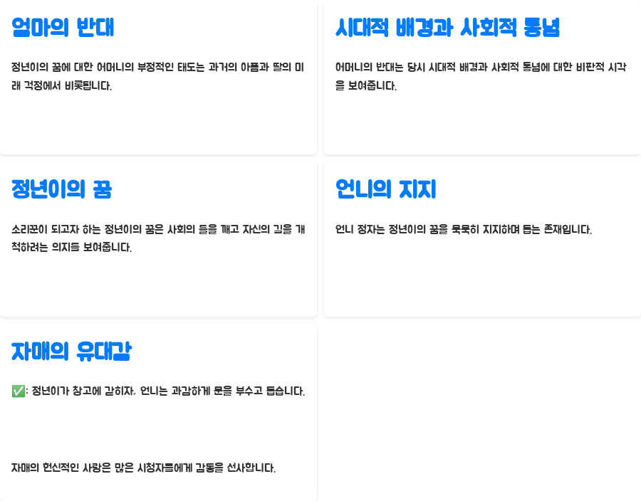 정년이가 소리꾼이 되고자 하는 꿈은 당시 사회의 틀에 갇히지 않고 자신의 길을 개척하려는 강한 의지를 보여줍니다. 하지만 이러한 갈등 속에서 정년이의 언니 정자는 그의 꿈을 묵묵히 지지하고 돕는 존재입니다.