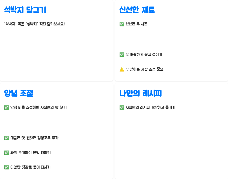가장 중요한 것은 신선한 재료를 사용하는 것과, 무를 깨끗하게 씻고 적절하게 절이는 것입니다. 무를 너무 오래 절이면 싱거워지고, 너무 짧게 절이면 맛이 제대로 들지 않습니다. 또한, 양념의 비율을 조절하여 자신만의 맛을 찾아보는 것이 중요합니다.