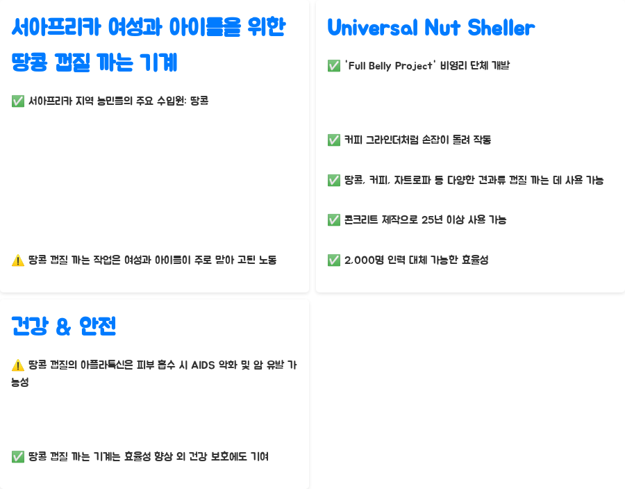 서아프리카 지역 농민들에게 땅콩은 주요 수입원 중 하나입니다. 하지만 땅콩 껍질을 까는 작업은 대부분 여성과 아이들이 맡아 하루 종일 허리 숙여 일해야 하는 고된 작업입니다. 이러한 문제를 해결하기 위해 'Full Belly Project'라는 비영리 단체에서 개발한 땅콩 껍질 까는 기계가 바로 'Universal Nut Sheller'입니다.