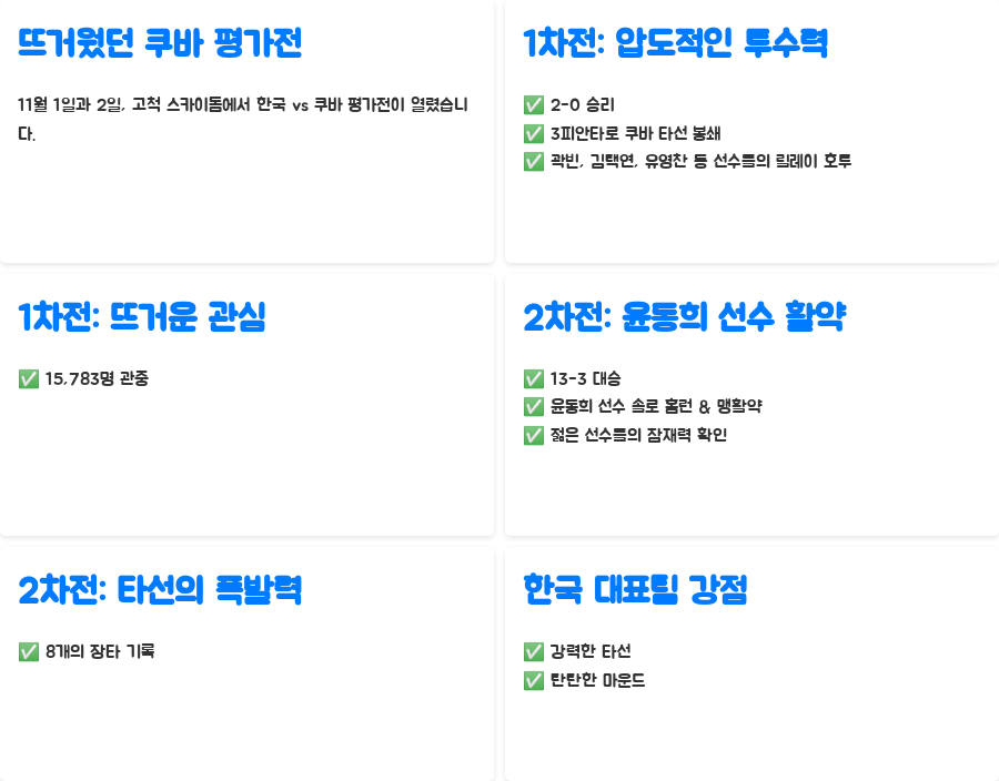 | 쿠바 평가전 | 1차전 2-0, 2차전 13-3 승리. 압도적인 투수력과 타선의 폭발력이 돋보임. |