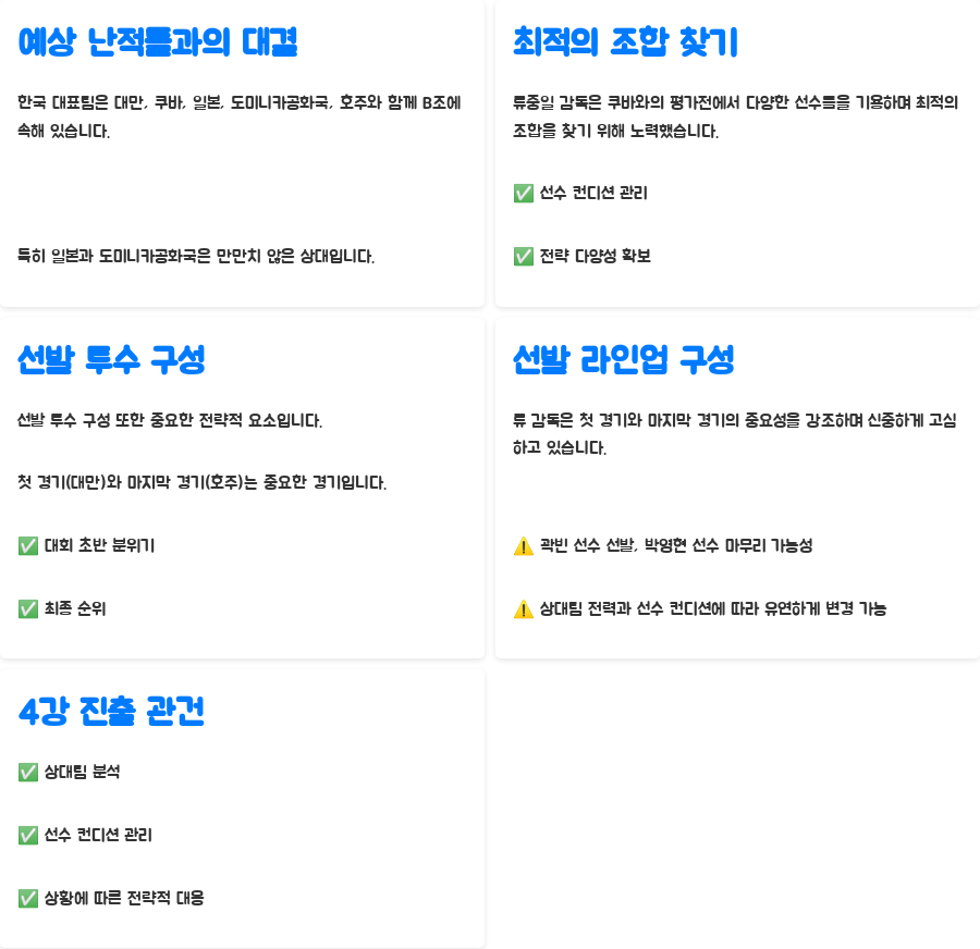 | 예선 B조 | 대만, 쿠바, 일본, 도미니카공화국, 호주와 경쟁. 류중일 감독의 전략적 지휘가 중요. |