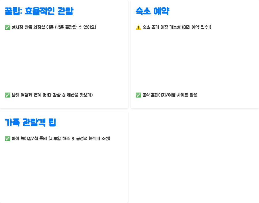 | 꿀팁 | 모자, 양산, 선글라스 필수, 돗자리 준비, 안쪽 화장실 이용, 남해 여행 연계 고려 |