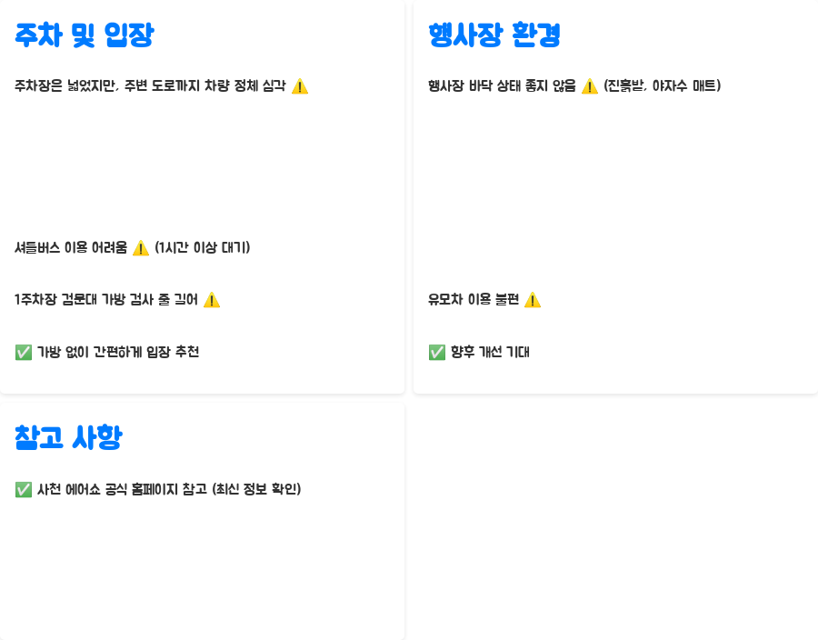 | 주차 및 입장 | 혼잡, 셔틀버스 대기시간 길어짐, 바닥 상태 불량 (진흙, 야자수 매트) |