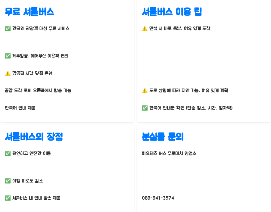 무료 셔틀버스는 단순한 이동 수단을 넘어 마쓰야마 관광의 첫인상을 결정짓는 중요한 요소가 됩니다. 편안하고 안전한 이동을 통해 여행의 피로도를 줄이고, 에히메현의 매력을 더욱 깊이 느낄 수 있도록 도와주니까요. 셔틀버스 내부에는 친절한 안내 방송이 나오는 경우도 있으니, 낯선 환경에서도 불안해하지 않고 여행을 시작할 수 있을 것입니다. 혹시 분실물이 발생했을 경우에는 이요테츠 버스 무로마치 영업소로 연락하시면 됩니다. (연락처: 089-941-3574)
