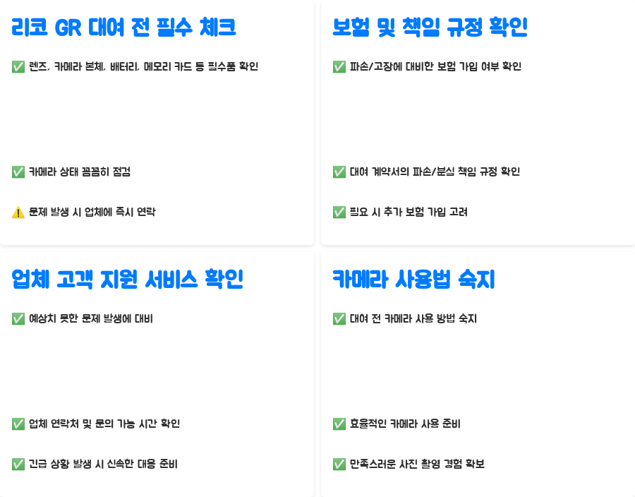 렌즈, 카메라 본체, 배터리, 메모리 카드 등 필수품 외에 추가적으로 필요한 물품이 무엇인지 미리 확인하는 것이 중요합니다. 대여 전에 카메라의 상태를 꼼꼼히 점검하고, 문제가 있다면 즉시 업체에 연락해야 합니다.