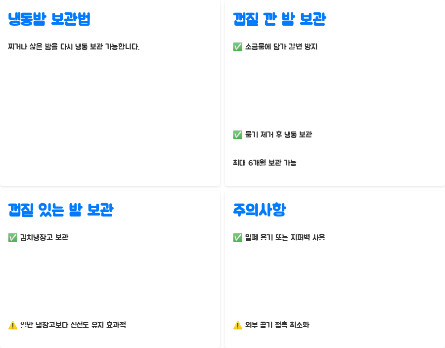 | 준비 | 냉동밤 해동 X, 흐르는 물에 깨끗이 씻기 | 얼음 제거 필수, 꼼꼼히 씻어 이물질 제거 |