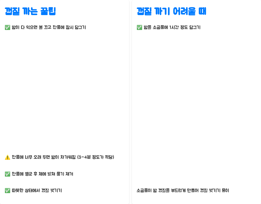 | 마무리 | 찬물에 헹구기 (3-4분) | 따뜻할 때 껍질 까기, 소금물에 1시간 담그기 (껍질 까기 어려울 때) |