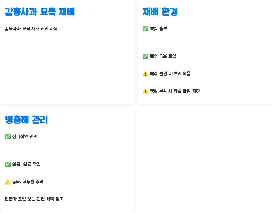A. 감홍사과는 동녹과 고두병에 취약하므로, 정기적인 병충해 관리가 필수적입니다. 또한, 햇빛이 잘 들고 배수가 잘 되는 토양에 심어야 건강하게 자랍니다. 전문가의 조언을 얻는 것도 좋은 방법입니다.