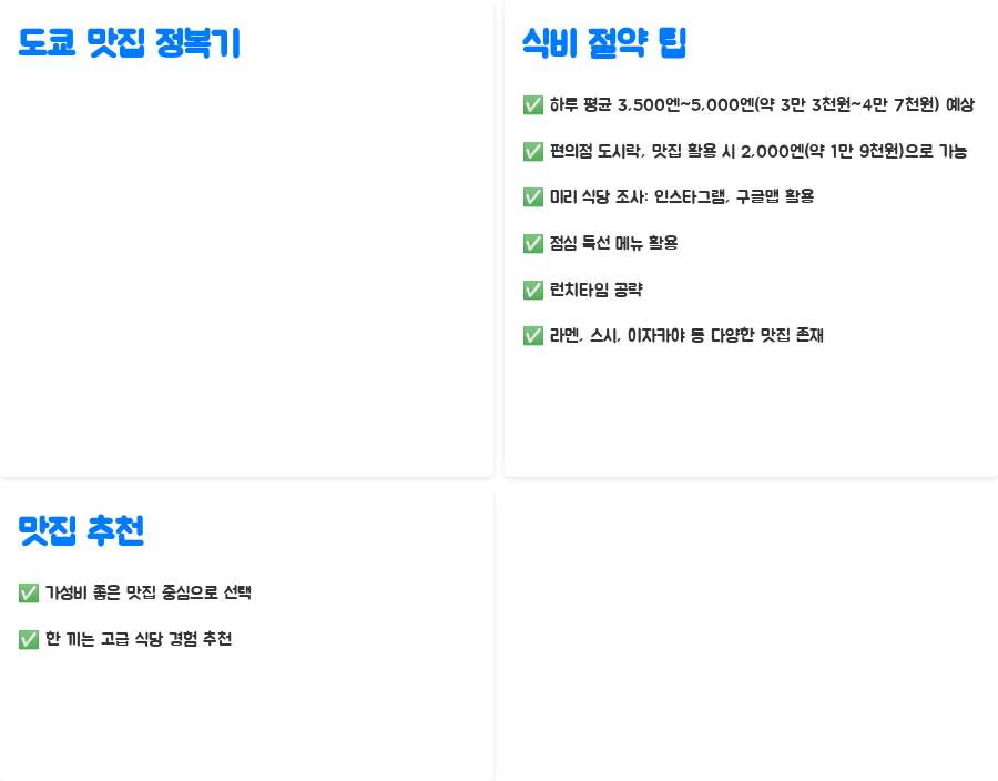 도쿄의 매력은 맛집 투어를 빼놓고 이야기할 수 없습니다. 하지만 맛집 투어는 예산을 훌쩍 넘길 수 있는 함정이기도 하죠. 하루 평균 3,500엔에서 5,000엔(약 3만 3천원~4만 7천원) 정도의 식비를 예상해야 하지만, 저렴한 편의점 도시락이나 맛집을 잘 찾는다면 2,000엔(약 1만 9천원)으로도 충분히 해결할 수 있습니다.