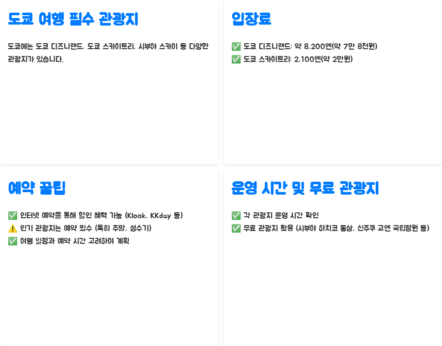또한, 각 관광지의 운영 시간을 미리 확인하고, 여행 일정에 맞춰 방문 계획을 세우는 것이 좋습니다. 무료 관광지를 적극 활용하면 입장료 비용을 크게 줄일 수 있습니다. 예를 들어, 시부야 하치코 동상이나 신주쿠 교엔 국립정원은 입장료가 없으니 무료 관광 코스를 잘 활용해 보세요.